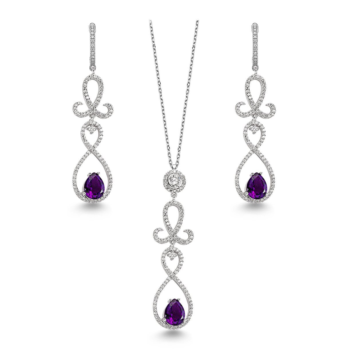 Mor ve Beyaz Taşlı 2’li Gümüş Kolye Küpe Seti